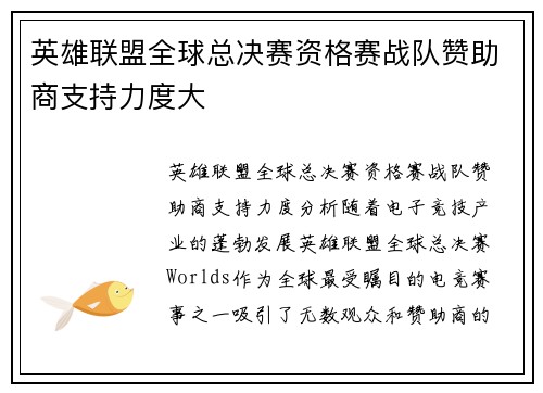 英雄联盟全球总决赛资格赛战队赞助商支持力度分析 随着电子竞技产业的蓬勃发展,英雄联盟全球总决赛(Worlds)作为全球最受瞩目的电竞赛事之一,吸引了无数观众和赞助商的关注。资格赛作为通往总决赛的关键...